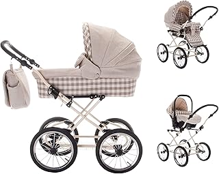 Friedrich Hugo Natureline Checked | 3 en 1 poussette combiné pack de voyage | Öko Nostalgie poussette | Couleur: Delphine Creme